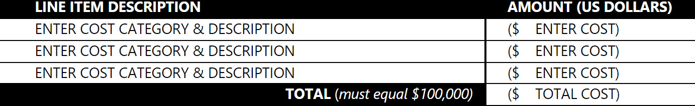 To help us understand your priorities, provide a detailed budget and specific line items for how the $100,000 award would be spent. Make sure that any funds identified in this table reflect and clarify your general explanations provided in the Budget Narrative above.
